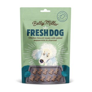 Betty Miller Fresh Dog Treats are wheat gluten free treats that contain peppermint for fresher breath and charcoal for digestion. No soya, wheat, eggs, dairy, pork or beet pulp. No artificial colours, no added preservatives, no added sugar.b