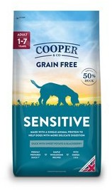 Cooper & Co Grain Free Sensitive 10kg Duck and Sweet Potato complete dog food. Vet approved gentle formula without grains. Hypoallergenic making it a suitable dog food for dog's with skin problems.