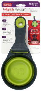 When collapsed, the KlipScoop clamps to the top of a food bag and lies flat against the side of the bag. With the bag tightly closed, the food stays fresh and the tempting smells stay inside the bag. At feeding time, the KlipScoop pops open and becomes a precise measuring cup for scooping the correct portion size of dry food.236ml.