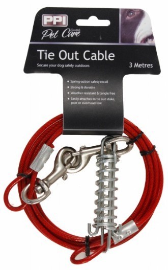 Details: 3m Tie Out Cable with spring action safety recoil, for securing your dog safely outdoors. Strong and durable and with a plastic coating, making it weather resistant. The tangle free cable easily attaches to a tie out stake, post or overhead line.