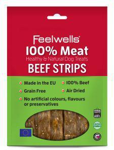 Feelwells dog treat meaty strips are made from 100% Meat.