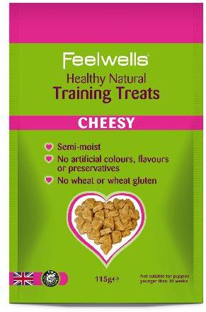Feelwell's Semi-moist cheesy training treat. No artificial colours, flavours or preservatives. No wheat or wheat gluten. Made with oats. Oven baked for more flavour and natural texture.