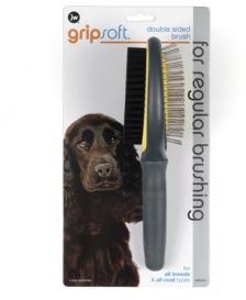 Details: The JW Double Sided Brush includes a Pin Brush on one side and a Bristle Brush on the other. Ideal for daily brushing of medium to long haired dogs the JW Double Sided Brush is suitable for use on all coat types and ideal if you have more than one dog with different types of coat. Use to tease out snarls and tangles, remove dead and shedding hair, general tidying / finishing and 'fluffing up' long coats and the feathers of flat coated dogs after brushing with a Slicker Brush
