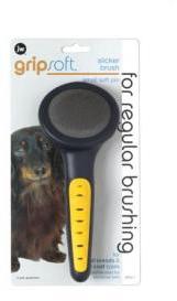 Details: The JW Small Slicker Brush has a round head and slightly angled pins mounted onto an air cushion to reduce excessive brushing force. Suitable for use on small to medium sized dogs and all coat types, the JW Small Slicker Brush is ideal for regular brushing, the removal of dead and shedding hair and knots, de-matting and general tidying / finishing.