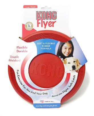 The KONG Flyer Large is Made from legendary KONG Made with durable KONG natural rubber, the Flyer is safe for teething and gums, this brand new flyer is both flexible and durable and will provide hours of fun exercise for you and your dog. It is great to throw and very easy for your dog.