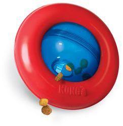The KONG Gyro large is sure to entertain your dog, with an irresistible ‘roll and flip’ action that entices and intrigues dogs. The dynamic centre-spinning orb and static outer ring encourage dogs to push, paw and roll the Gyro, delightfully dispensing tasty treat rewards along the way. Ideal for independent play. Stuff with snacks or kibble for added fun and extended playtime.