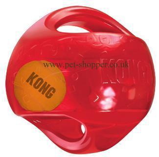 The KONG Jumbler is a two-in-one ball toy for twice the interactive fun. The interior features a tennis ball inside and loud squeak to entice play, while the handles make pick up and shaking easy. The Jumbler stands up to tough play, making it ideal for games of fetch. When tossed, rolled, or shaken, the interior tennis ball rumbles and rolls inside the Jumbler.