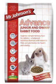 Mr Johnson's Advance junior & dwarf RABBIT FOOD contains a balanced diet in every mouthful therefore overcoming selective feeding. Rabbits, if overfed, can become overweight therefore rabbits should be fed twice a day, dividing their daily requirements into two meals, feeding morning and evening only refilling the bowl once empty.
