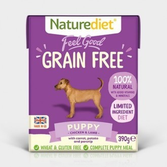 Naturediet Puppy food Grain Free menu is a complete feed for your dog. This high quality and appetising menu is made from freshly prepared Chicken & Lamb and is nutritionally balanced for puppies. You can be assured that this menu is completely grain and gluten free yet contains everything your puppy needs for healthy growth and development. Suitable from weaning to approximately 6 months of age.
