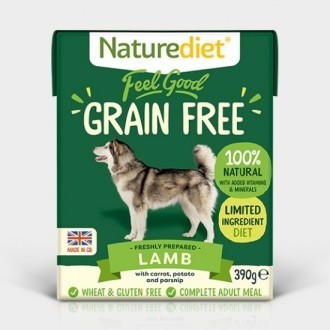 Naturediet Grain Free Lamb contains no artificial preservatives, colourings or flavourings. We use only freshly prepared lamb and only lamb reducing the risk of allergy. Naturediet Grain Free Lamb and is totally gluten free. Our vegetables are carrots, potatoes and parsnips. Suitable for all types of adult and senior dogs.