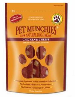8 packets of Pet Munchies Chicken & Cheese treats, premium treats made from the finest ingredients, no artificial additives or preservatives.