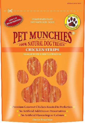Chicken Strips What better way to let your dog have a 100% Natural Treat. They are made from the finest quality meat delicately cooked in its own natural juices. They are high in protein and low in fat and carbohydrates. 100% Chicken Breast Meat 100g Re-Sealable Bag