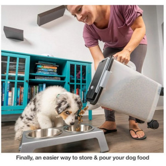 PetFusion’s portable food container includes wheels and a top handle to conveniently move within or between rooms. The adjustable spout is handy to increase or decrease food pour speed and a large rear ‘teapot’ handle makes refilling your pet’s food bowl easy.