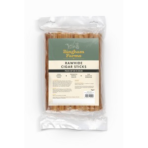 Bingham Farms 25cm Rawhide Cigar Sticks 20 Pk These delightful cigar sticks are suitable for dogs above 6 months and offer a natural and nutritious chewing experience. Made with top-quality cuts of premium rawhide, they provide a wholesome and enjoyable treat.