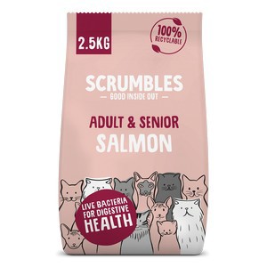 Scrumbles Dry Cat Food for Adult and Senior Cats with Salmon Flavour 2kg. This is a complete, natural pet food with added probiotics for adult cats over 12 months old.