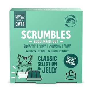 Scrumbles complete and naturally grain free selection of classic recipes in jelly are packed with up to 60% meat or fish, free from colours, preservatives and added sugars or salts. Including prebiotic slippery elm for digestive health, this meaty selection includes chicken, salmon, tuna & turkey recipes.