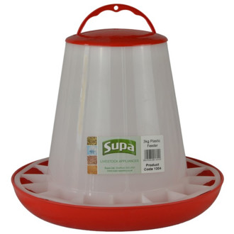 Durable plastic poultry feeder 3 kg with twistlock base fitting, anti scrape ring and hanging handle.
