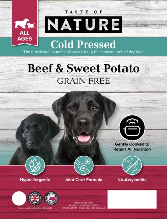 Taste of Nature Dog Food Grain Free Beef. A hearty, grain-free blend of beef and sweet potato, cold pressed to lock in nutrients and enhanced with collagen and joint care.