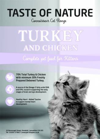 Taste of Nature's Connoisseur Kitten Food Connoisseur range has been specifically developed to provide a selection of high protein and high total animal content recipes that are irresistible to cats. The range has been formulated to offer an assortment of the finest freshly prepared animal protein sources with added functional ingredients to help care for a cat’s health.