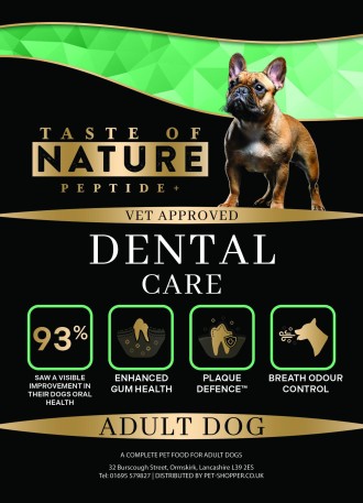 Taste of Nature oral care recipe. Dental health is crucial for dogs because it directly impacts their overall well-being and quality of life. Over 80% of dogs over the age of three suffer from some form of dental disease. Poor oral hygiene can lead to painful conditions affecting a dog’s ability to eat, groom, and stay active.