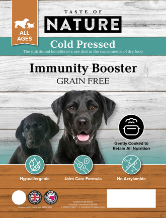 Taste of Nature Immunity booster dog food contains 32% Turkey. A unique combination of herbs, joint care blend, Glucosamine, Collagen, Spirulina, Green lipped mussel and chondroitin sulphate all work exceptionally well to boost immunity but the main ingredient is spirulina.