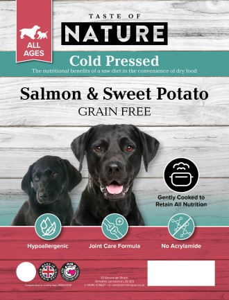 Taste of Nature Dog Food Salmon & Sweet Potato is packed with omega-rich salmon and sweet potato, this gentle, grain-free recipe includes our exclusive joint care formula with collagen for healthy, happy joints.