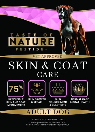 A dog’s skin and coat condition and appearance serve as immediate indicators of its overall health and well-being.Canine dermatological disorders have been recognised by veterinary surgeons as a major issue in small animal practice, with an estimated 15-30%of the dog population worldwide affected by skin conditions.The Peptide+ Skin & Coat Care recipe has been specifically formulated to help aid skin and coat issues using the power of peptides.