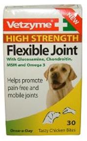 Details: Vetzyme High Strength Flexible Joint With Glucosamine, Chondroitin, MSM and Omega 3 Helps promote pain-free and mobile joints You see the signs, the dog has trouble getting to its feet and struggles getting up the stairs. Ideally, before these signs develop, take action to help maintain your dog’s joint health. Vetzyme High Strength Flexible Joint has been specifically formulated to help maintain pain-free, supple and mobile joints, helping to ensure your dog has a better quality of life as it enters its golden years.